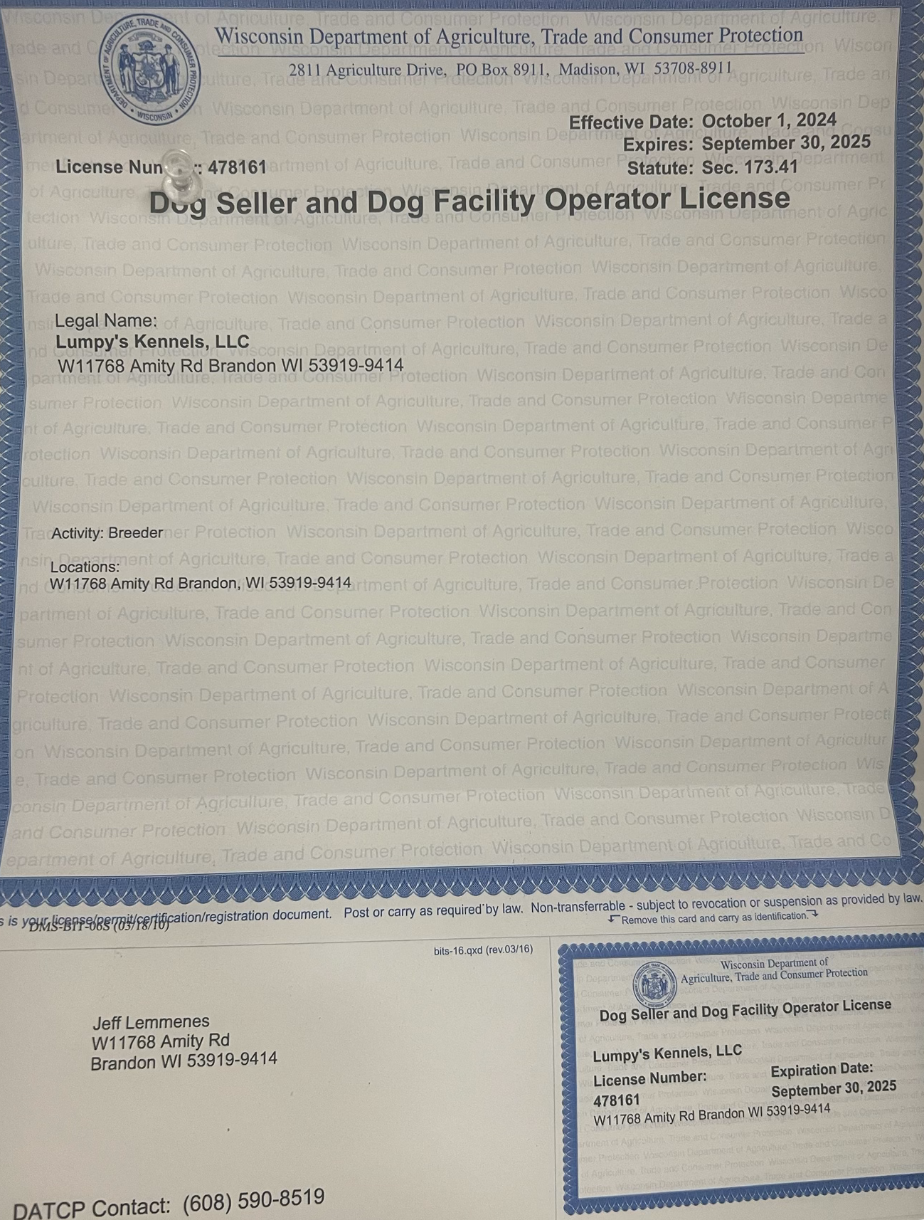Click here to view Lumpy's Kennel WI Kennel Operators License.