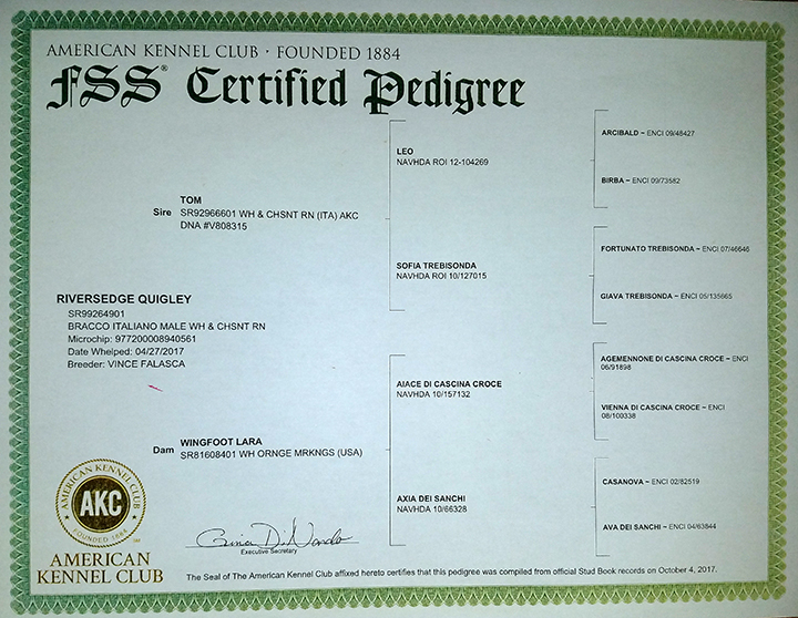 Pedigree – OFA Health CertificationsRousseau - Rousseau is a wonderful representation of a Bracco Italiano-in the field, show ring, and our home. In the field, he is methodical and hunts at a beautiful trot. He prefers to work as a true partner in the field and thrives when treated as such. In the show ring, Rousseau has been shown selectively to his AKC Championship, and we look forward to continuing his career as he matures. At home, he is docile and loving, with a wonderful temperament. He has never shied away from any task asked of him, always showing confidence and willingness to please.